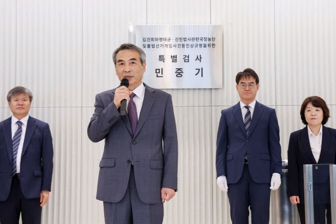 윤석열 전 대통령 부인 김건희 여사와 관련한 각종 의혹 사건을 수사하는 민중기 특별검사가 지난 2일 서울 종로구 KT광화문빌딩에 마련된 사무실 앞에서 현판 제막을 한 뒤 발언하고 있다. /공동취재 |