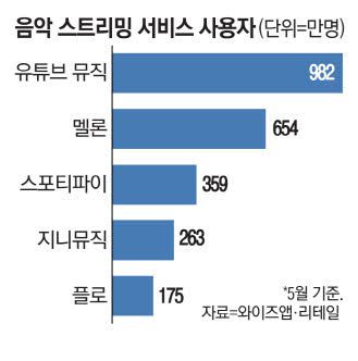 구글은 그간 국내에서 유튜브 동영상과 음악 서비스가 결합된 유튜브 프리미엄 상품만 판매했다. 영상 스트리밍 분야의 선두 서비스가 음악 스트리밍까지 함께 제공하면서 자연스럽게 시장을 독식했다. 와이즈앱·리테일에 따르면 지난 5월 기준 음악 스트리밍 앱 월간활성이용자는 유튜브 뮤직 982만명, 멜론 654만명, 스포티파이 359만명, 지니뮤직 263만명, 플로 175만명 순이다.