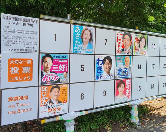 3일 일본 가나가와현 한 공원 앞에서 참의원 선거 게시판에 입후보자들의 사진이 붙어 있다. 중앙포토.