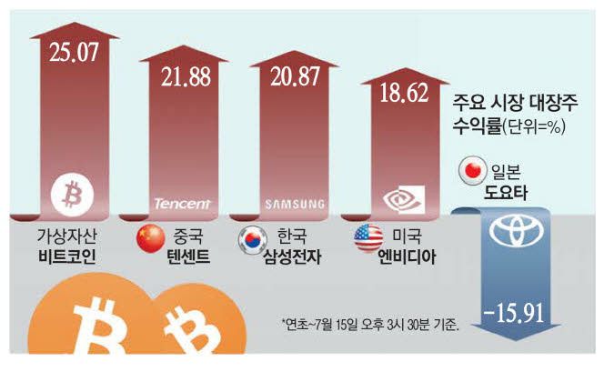 올해 주요 자산시장 내 대장주 수익률이 '도널드 트럼프 효과'에 엇갈린 것으로 나타났다. 올 1분기만 해도 대부분의 자산이 관세 쇼크에 하락세를 보였지만 이후 미국 정책 여파에 따라 엇갈린 흐름을 보였다. 비트코인은 도널드 트럼프 미국 대통령을 중심으로 미국 주도의 제도화가 급진전되면서 높은 수익률을 기록했다. 반면 트럼프 효과에 가장 크게 악영향을 받은 건 일본의 대장주인 '도요타'였다. 수출 위주의 자동차 산업은 미국의 관세 부과 영향이 크기 때문이다.