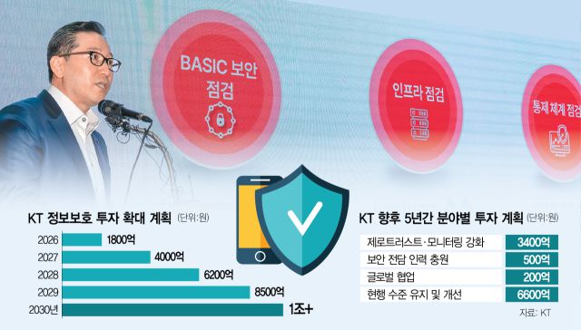 KT는 15일 ‘KT 고객 안전·안심 브리핑’을 열고 “2030년까지 정보보호 투자 규모를 글로벌 빅테크 수준인 1조 원 이상으로 확대할 것”이라며 이라고 밝혔다. 올해 한국인터넷진흥원(KISA) 공시된에 따르면 KT의 2023년 기준 연간 정보보호 투자 금액은 1250억 원이다. KT는 지금까지 해마다 정보보호 투자 규모를 2~3%씩 늘려 왔지만 내년부터는 투자 규모를 연평균 2000억 원 수준으로 확대한다. 구체적으로 △AI 모니터링 체계 강화 △글로벌 협업 및 진단 컨설팅 확대 △제로트러스트(Zero Trust) 체계 완성 △보안전담인력 확충 등 4대 정보보호 혁신을 추진한다.