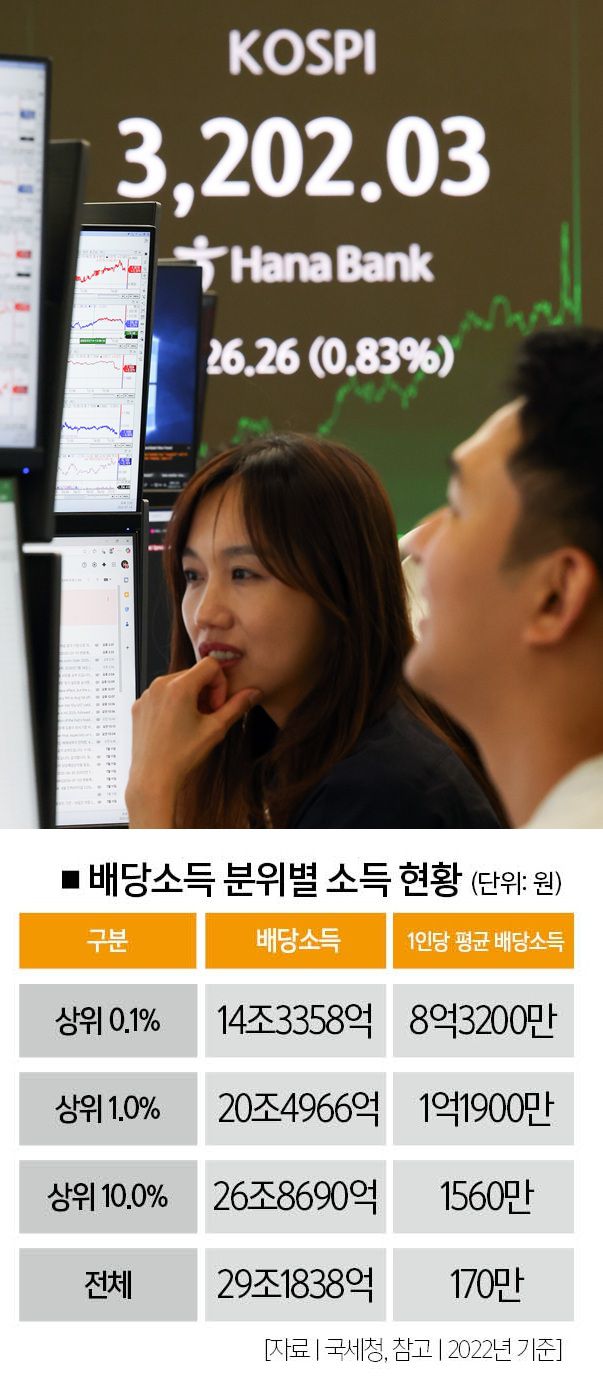국세청의 배당소득 분위별 소득 현황을 보면, 2022년 기준 배당소득 상위 0.1%가 전체 배당의 49.1%를 가져갔다. 상위 10%로 넓히니 전체 배당의 92.1%가 이들에게 집중됐다(양경숙 더불어민주당 전 의원).
