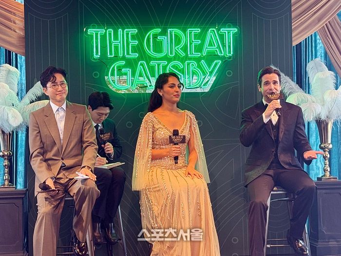 15일 뮤지컬 ‘위대한 개츠비’ 오리지널 서울 론칭 프레스콜에서 (왼쪽부터) 신춘수 프로듀서와 ‘데이지’ 역 센젤 아마디, ‘개츠비’ 역 매트 도일이 한국 관객들에게 처음 인사하고 있다. 사진 | 표권향 기자 gioia@sportsseoul.com |