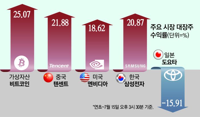 올해 주요 자산시장 내 대장주 수익률이 ‘도널드 트럼프 효과’에 엇갈린 것으로 나타났다. 올 1분기 만해도 대부분의 자산이 관세 쇼크에 하락세를 보였지만 이후 미국 정책 여파에 따라 엇갈린 흐름을 보였다.