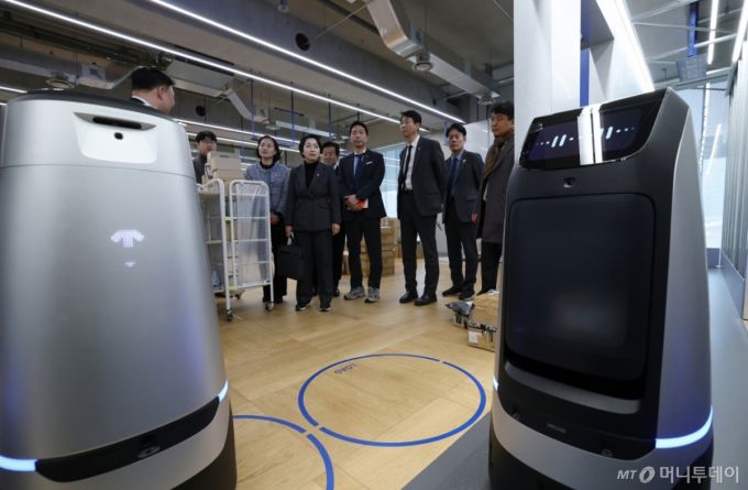 국회 과학기술정보방송통신위원들이경기 성남시 분당구 네이버 1784에서 열린 AI 산업 발전을 위한 현장 소통 간담회를 마치고 사내 배송 로봇 시연을 살펴보고 있다. /사진=뉴스1 |