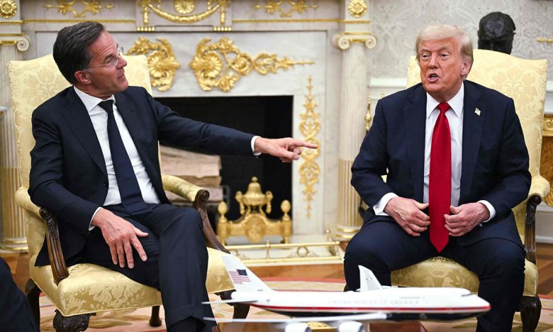 입장 바꾼 트럼프 14일(현지시간) 미국 워싱턴 백악관 집무실에서 도널드 트럼프 대통령(오른쪽)이 마르크 뤼터 나토 사무총장과 회담하고 있다. 워싱턴=AFP연합뉴스 |