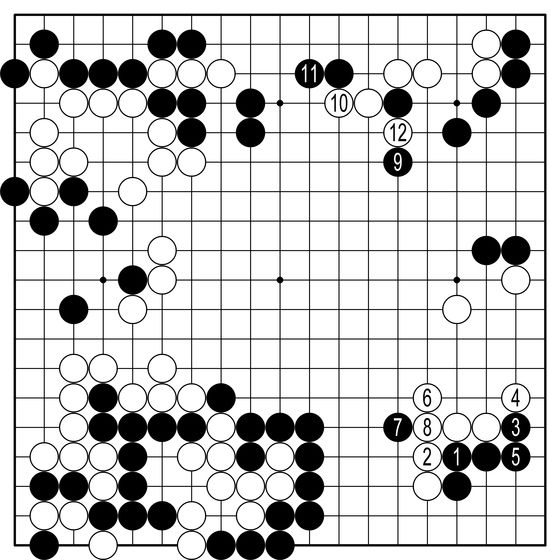 ◆실전 진행=딩하오는 흑1 다음 3, 5로 젖혀 이었는데 놀라운 변신이었다. 흑1은 극히 하수의 수법이지만 지금은 가장 실용적인 수법이었다. 바둑의 깊이는 실로 끝이 없다.