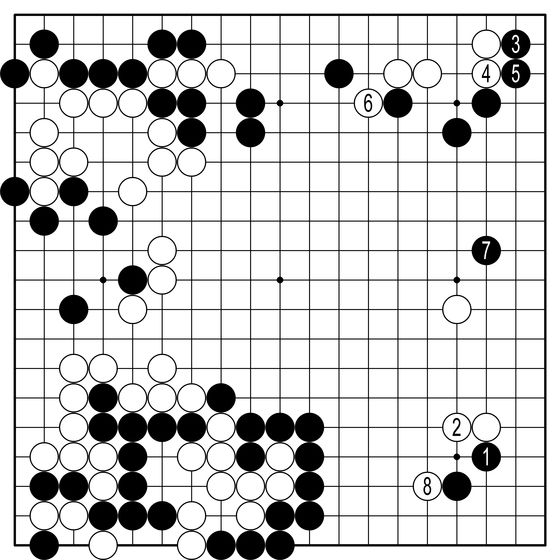 장면⑦=포연이 그치고 판 위엔 시체가 널려 있다. 좌변은 흑이 죽었고 하변은 백이 죽었다. 좌변 백집은 줄잡아 58집. 굉장한 집이다. 하지만 백은 다른 곳에 별 집이 없다. 우상은 아직 미생이고 우하 백은 조금 엷다. 흑은 어떤가. 확정가만 따지면 흑도 덤을 낼 정도로 풍족한 형편은 아니지만 귀중한 선수를 쥐고 있다. 전략을 구사해 나가기엔 흑 쪽이 편하다. 딩하오는 흑1을 선수하고 다시 3, 5로 추궁한다. 7은 큰 곳. 모두 실리에 민감한 곳을 두고 있다. 신진서는 8로 붙였는데 AI는 방향은 맞았으나 방법이 틀렸다고 한다.