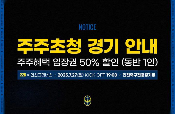 인천 유나이티드는 27일 오후 7시 인천축구전용경기장에서 열리는 안산 그리너스와의 '하나은행 K리그 2 2025' 22라운드 홈경기를 '시민 주주의 날로' 지정하고 시민 주주를 위한 입장권 할인, 경기장 내 CU 편의점 할인 등 이벤트를 마련했다고 15일 밝혔다.
