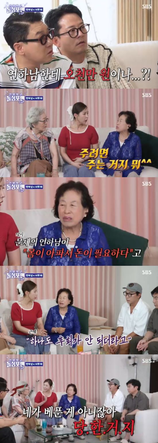그리고 이날 전원주는 연하남으로부터 5000만원을 뺏긴 적이 있다고 말해 궁금증을 자아냈다. 전원주는 "달라고 하면 줄 수 있다. 그 때는 아프다고 해서 수술비를 준거였는데 거짓말이었다. 근데 후회가 안 된다. 있는 사람이 베풀어야한다고 생각을 한다"고 했다.