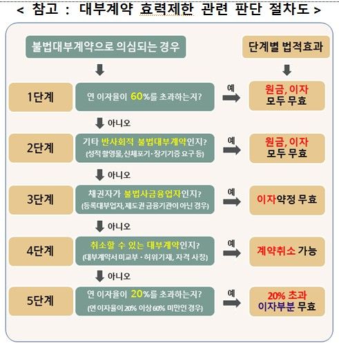 개정안에 따라 불법 대부계약 효력을 제한해 범죄 이득을 박탈하는 등 불법사금융을 억제하는 법적 근거가 시행된다. 기존에는 최고금리 초과시 초과된 이자만 무효로 규정했지만 22일부터는 이에 더해 성착취·인신매매·신체상해, 폭행·협박·채무자 궁박 등을 이용해 대부이용자에게 현저히 불리하게 체결된 계약, 최고금리(20%)의 3배인 연 60%를 초과하는 초고금리 대부계약 등 반사회적인 불법대부계약은 원금과 이자를 전부 무효로 한다.