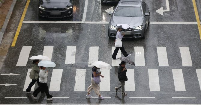 특히 서쪽 지역을 중심으로 매우 강한 비가 내리는 곳이 있겠다. 이날 오후부터 경기남부, 강원남부내륙 및 산지, 대전·세종·충남, 충북중·북부에는 시간당 최대 30~50㎜의 비가 내리겠다. 서울, 인천, 경기북부, 강원 중·북부내륙 및 산지, 충북남부에는 시간당 최대 30㎜의 비가 오겠다.