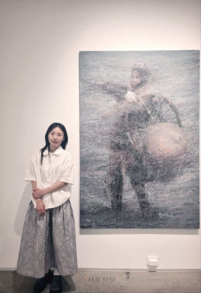 ‘2025 전국청년작가 미술공모전’(H-EAA)에서 대상을 차지한 신민정 작가가 경기 과천 호반아트리움에서 제주 해녀를 드리핑 기법으로 그린 본인의 작품 ‘읏쌰’를 소개하고 있다. 신 작가를 비롯해 이번 공모전의 최종 7인에 오른 작가들의 전시 ‘피어나는 시간’은 다음달 17일까지 계속된다.