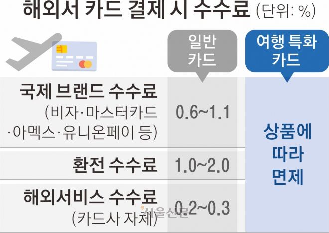 일반적인 카드로 해외에서 결제하면 수수료가 이중, 삼중으로 붙는다. 기본적으로 환전 수수료 1~2%에, 비자·마스터카드·아멕스·유니온페이 등 국제 브랜드 수수료가 0.6~1.1% 추가되고, 카드사 자체 해외서비스 수수료가 0.2~0.3% 더해진다. 총 3% 안팎의 높은 수수료가 붙는다.