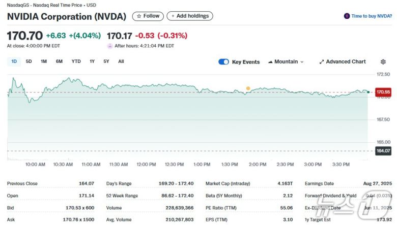 엔비디아 4% 급등, 170달러 돌파…시총 4.2조달러 근접