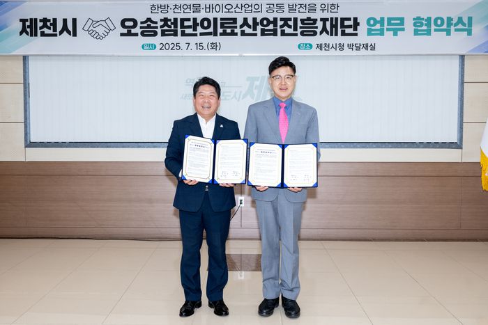 오송첨단의료산업진흥재단(KBIOHealth)은 15일 제천시청에서 제천시와 한방·천연물·바이오산업의 지속 가능한 발전과 상호 협력을 위한 업무협약(MOU)을 체결했다고 밝혔다.