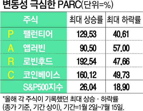 월가 출신의 CNBC 투자 방송 진행자 짐 크레이머가 팰런티어, 앱러빈, 로빈후드, 코인베이스를 ‘밈 주식’으로 평가하며 이들의 알파벳 앞글자를 딴 신조어 ‘PARC(파크)’를 제시했다. 상승 동력만큼이나 하락 우려도 큰 이들 주식은 올해 S&P500지수보다 강한 변동성을 보이고 있다.