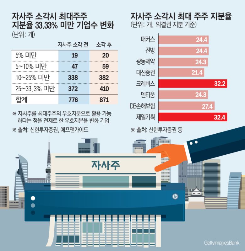 상장사 관계자는 “자사주 소각 의무화는 경영권 위협의 불씨가 될 수도 있어 기업으로서는 배당·인수합병(M&A)·자사주 전략 등 전반적인 자본 정책을 전면 재설계해야 할 상황”이라며 “특히 우호지분을 합쳐 33.3%를 밑돌게 되는 기업들은 내부지분 확충, 자사주 소각 시기 조정, 우호세력 구축 등 즉각적인 대응책 마련에 분주한 상황”이라고 말했다.