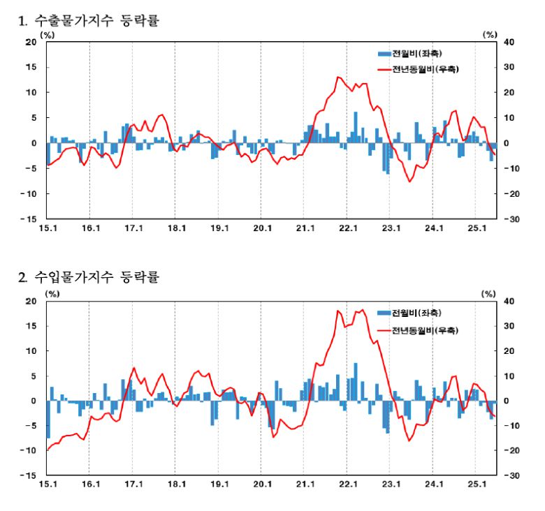 품목별로 보면 원자재는 원유 등 광산품을 중심으로 1.5% 상승했으나, 중간재(-1.6%), 자본재(-1.1%), 소비재(-1.0%)는 모두 하락했다.