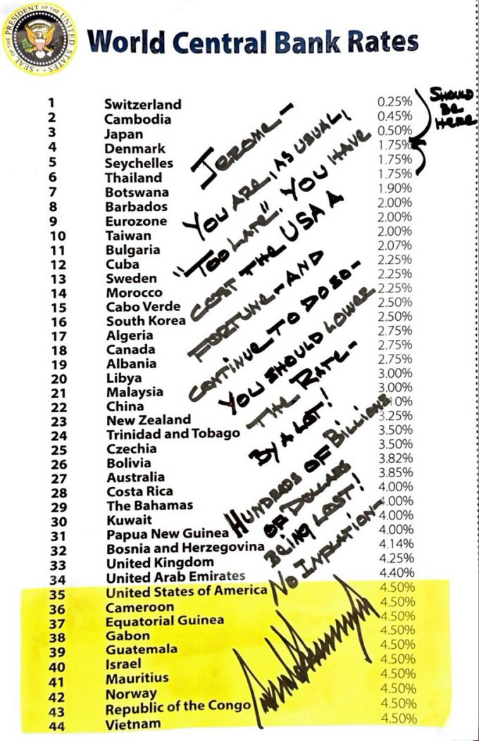도널드 트럼프 미국 대통령이 30일 소셜미디어 '트루스소셜'에 게재한 자필 메모. 트럼프 대통령은 국가별 기준금리가 적혀 있는 표 위에 자필로 "제롬, 당신은 항상 그렇듯이 '너무 늦었다'라면서 기준금리표 상 일본(0.75%)과 덴마크(1.75%) 사이에 표시한 뒤 '여기 있어야 한다'라고 적었다. 캐롤라인 레빗 백악관 대변인은 "미국 국민은 저금리로 돈을 빌리고 싶어한다"면서 "그러나 불행히도 금리가 여전히 너무 높아, 대통령은 오늘 연준 의장에게 이 메모를 보냈다"라고 밝혔다. /사진=뉴스1 |