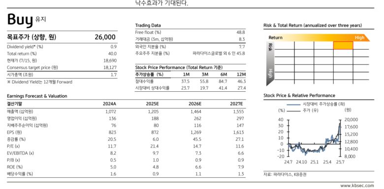 KB증권이 파라다이스 에 대해 중국인 단체관광객 무비자 확대 정책의 최대 수혜주라며 목표주가를 기존 2만 원에서 2만6000원으로 30% 상향했다. 투자의견은 ‘매수(Buy)’를 유지했다. 전날 종가는 1만8690원이다.