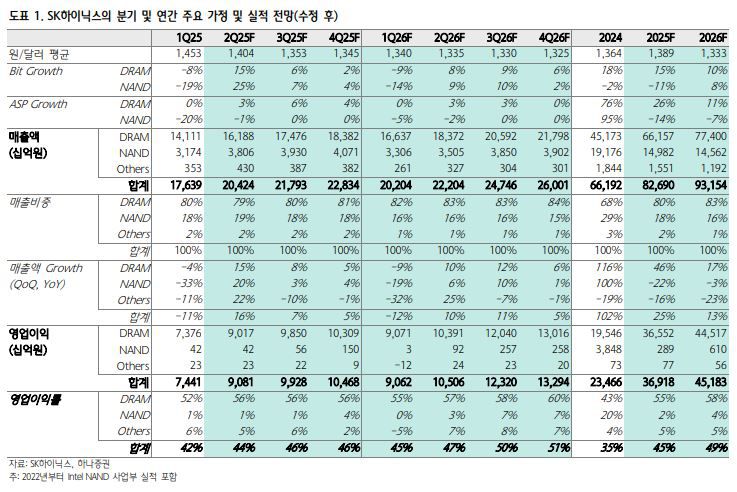 2분기 매출액은 20조4000억 원, 영업이익은 9조800억 원으로 전망했다. 기존에 가정했던 환율보다 30원 이상 하락하면서 영업이익에서 3000억 원 이상 하향 조정했다. 김 연구원은 “다만 기존에 추정했던 것보다 관세에 따른 선제적인 물량 증가가 일부 파악돼 비트 그로스(bit growth)는 디램(DRAM)을 기존 11%에서 15%로, 비휘발성메모리(NAND)를 20%에서 25%로 상향조정했다”고 밝혔다.