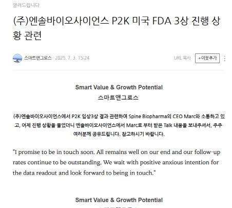 엔솔바이오 관계자는 “P2K의 적응증 등 추가적인 기술수출로 스파인바이오파마와는 의사소통 라인을 긴밀히 유지하고 있다”며 “다만 P2K 임상 3상 톱라인 결과가 나올 때까지는 구체적인 내용을 공개하기는 어렵다”고 말했다.