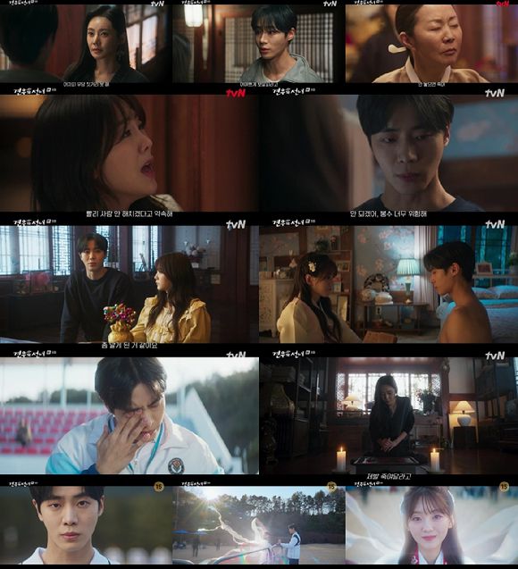15일 방송된 tvN 월화드라마 '견우와 선녀'(연출 김용완, 극본 양지훈, 기획 CJ ENM, 제작 스튜디오드래곤·덱스터픽쳐스·이오콘텐츠그룹) 8화에서는 박성아(조이현 분)와 배견우(추영우 분)가 악귀 봉수(추영우 분)를 다루는 법을 찾아냈다. 배견우가 총소리에 반응하는 봉수의 트라우마를 이용해 사람을 해치지 않겠다는 약속을 받아낸 것. 박성아 역시 귀신을 하루 동안 억누르는 억매법을 써 배견우의 양궁대회 출전을 도왔다. 두 사람의 고군분투에도 위기는 찾아왔다. 봉수의 도발에 자극받은 염화(추자현 분)가 화합술을 부려 배견우의 영안(靈眼)이 열리는 엔딩은 위기감을 증폭시켰다.