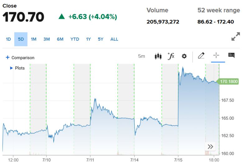 엔비디아는 전 거래일 대비 4.04% 상승한 170.70달러에 마감했다. 중국으로의 반도체 수출이 다시 활로를 찾았다는 소식이 호재로 작용했다. 엔비디아 주가는 사상 처음으로 170달러를 넘으면서 최고치도 경신했다.