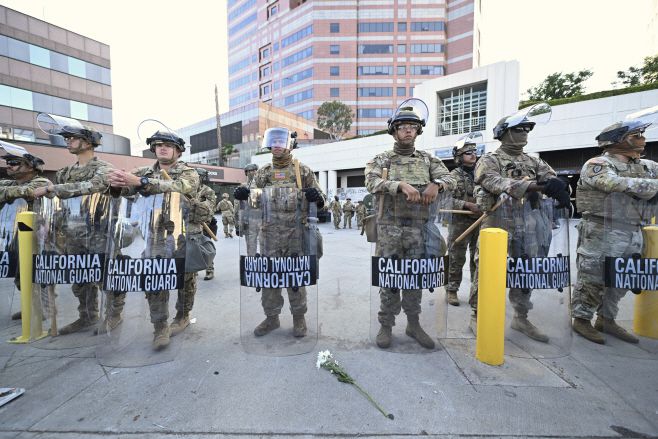 지난달 12일(현지시간) 미국 로스앤젤레스(LA) 연방 청사 앞을 캘리포니아 주방위군이 막고 서 있다./AP 연합