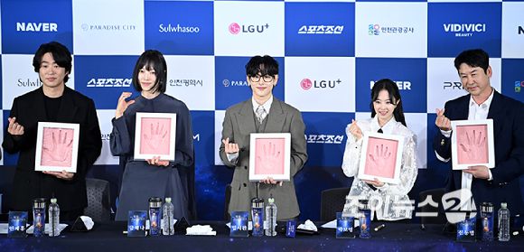 배우 안재홍, 금해나, 임시완, 박보영, 개그맨 신동엽이 25일 오전 서울 영등포구 CGV 여의도에서 열린 청룡시리즈어워즈 핸드프린팅 행사에서 포토타임을 갖고 있다. [사진=곽영래 기자] |