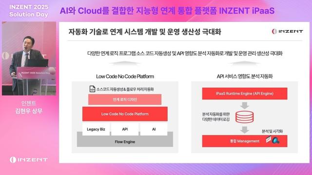 이러한 문제를 해결하기 위한 전략으로 인젠트는 iPaaS(Integration Platform as a Service) 기반 플랫폼을 제시했다. 김 상무는 “iPaaS는 다양한 시스템, 채널, 데이터, API를 단일 환경에서 연결하고 운영할 수 있도록 지원하는 클라우드 기반 통합 플랫폼”이라며 “통합과 자동화, 지능화를 아우르는 아키텍처를 통해 기업 연계 복잡성을 실질적으로 해소할 수 있다”고 설명했다.