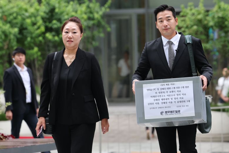 강씨는 이날 변호인과 함께 오전 9시 48분쯤 특검 사무실이 있는 서울 KT광화문웨스트빌딩에 도착했다. 강씨 측은 증거자료를 임의제출하겠다면서 회색의 이삿짐 포장 박스에 명씨가 사용했던 PC와 강씨가 사용한 하드디스크, SSD 및 포렌식 자료를 담아왔다. 또 명씨가 실소유한 여론조사 업체 미래한국연구소가 수행했던 여론조사를 정리한 자료와, 강씨의 계좌 내역도 챙겨왔다. 김 전 의원과 강씨가 사용한 휴대전화도 제출 대상에 포함됐다.