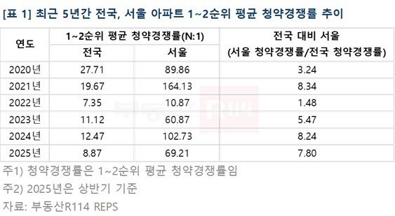 [서울=뉴스핌] 조수민 기자 = 올해 상반기 전국 아파트 1~2순위 평균 청약경쟁률은 8.9대 1로 2024년(12.5대 1)보다는 둔화했다. 그러나 서울은 여전히 전국 대비 7.8배에 달하는 경쟁률을 기록했다. 최근 5년간 서울과 전국 청약경쟁률 격차는 2021년 8.3배까지 치솟은 뒤 1.5배로 감소했으나, 여전히 서울 청약시장은 희소성과 선호 입지 중심의 쏠림 현상으로 전국에서 최고 수준의 경쟁률을 이어가고 있다.