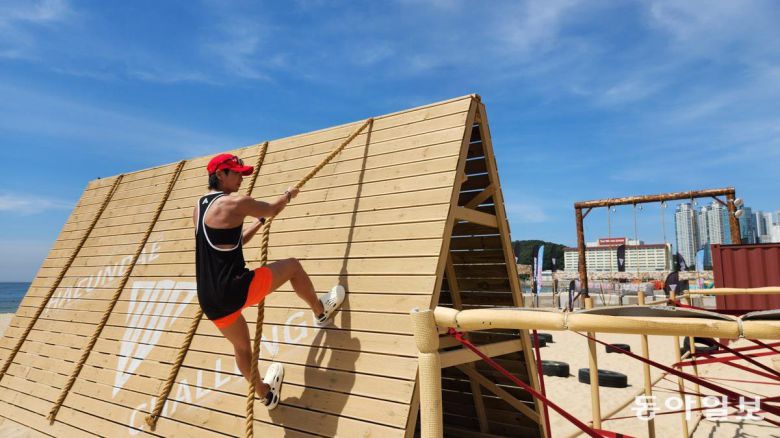 6일 오전 10시 부산 해운대해수욕장. 체험객을 맞으려고 백사장에 설치된 통나무 넘기 시설을 점검하던 이교진 씨가 웃으며 말했다. 그는 “하루에 100명 넘는 이들이 방문하는데 이달 말 성수기가 되면 더 많은 이들이 몰릴 것”이라고 했다. 이 씨는 1일부터 ‘강철부대 해운대 챌린지’를 이곳에서 운영하고 있다. TV에서 인기를 끌었던 밀리터리 예능 프로그램 ‘강철부대’에 나왔던 미션을 누구나 체험해 볼 수 있도록 공간을 꾸몄다. 해수욕장 중앙부터 동백섬 방향 200m 백사장에 꾸며진 ‘프로모션존’에는 타이어 뒤집기와 그물 넘기, 수직벽 건너기 등 군 유격 훈련 등에 쓰이는 16개 체험 시설이 설치되었다. 최영재 교관 등 강철부대 출연자 10명이 상주하며 참가자가 안전하게 체험할 수 있도록 돕는다. 육군 특수임무대 중사 출신으로 강철부대에 출연한 조성원 씨는 “TV 속 대원이 어려움을 겪으며 수행한 타이어 뒤집기 등을 직접 체험해 보고 즐거워하는 이들이 많다”고 말했다.