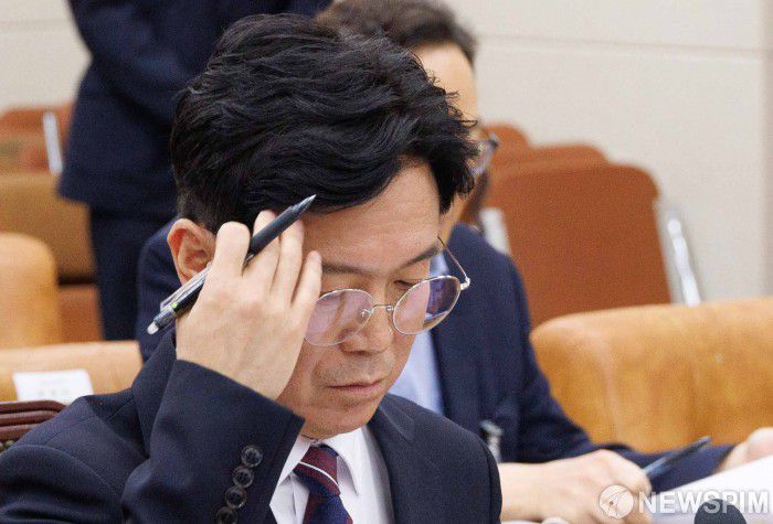 [서울=뉴스핌] 윤창빈 기자 = 김영훈 고용노동부 장관 후보자가 16일 오전 서울 여의도 국회에 환경노동위원회 전체회의에서 열린 인사청문회에서 자료를 확인하고 있다. 2025.07.16 pangbin@newspim.com