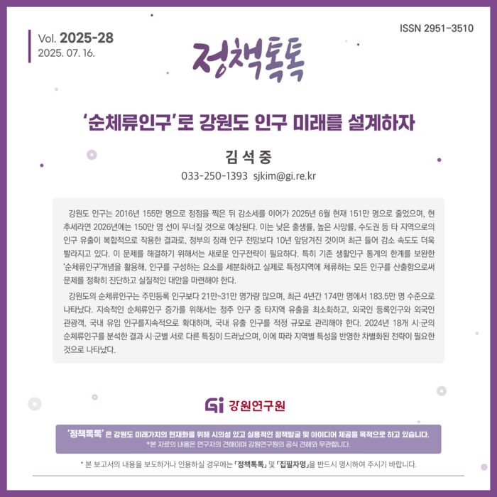 [스포츠서울ㅣ춘천=김기원기자]강원연구원(원장 현진권)은 「‘순체류인구’로 강원도 인구 미래를 설계하자」라는 제목으로 2025년 제28호 정책톡톡을 발간했다.