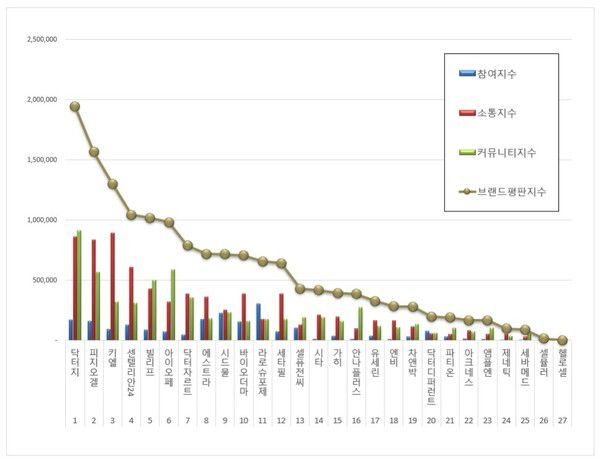 더마화장품 브랜드평판 1위를 기록한 닥터지 브랜드는 참여지수 171,803 소통지수 860,456 커뮤니티지수 911,851이 되면서 브랜드평판지수 1,944,110으로 분석됐다. 지난 6월 브랜드평판지수 1,954,397과 비교해보면 0.53% 하락했다.