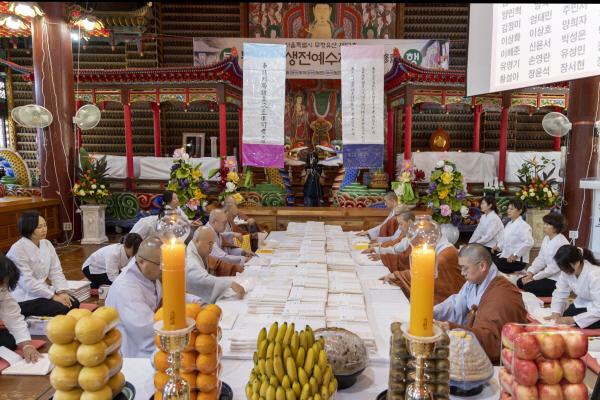 봉은사 생전예수재를 위해 지전 등 장엄물을 만드는 작업에 참여 중인 스님들과 신도들./제공=봉은사