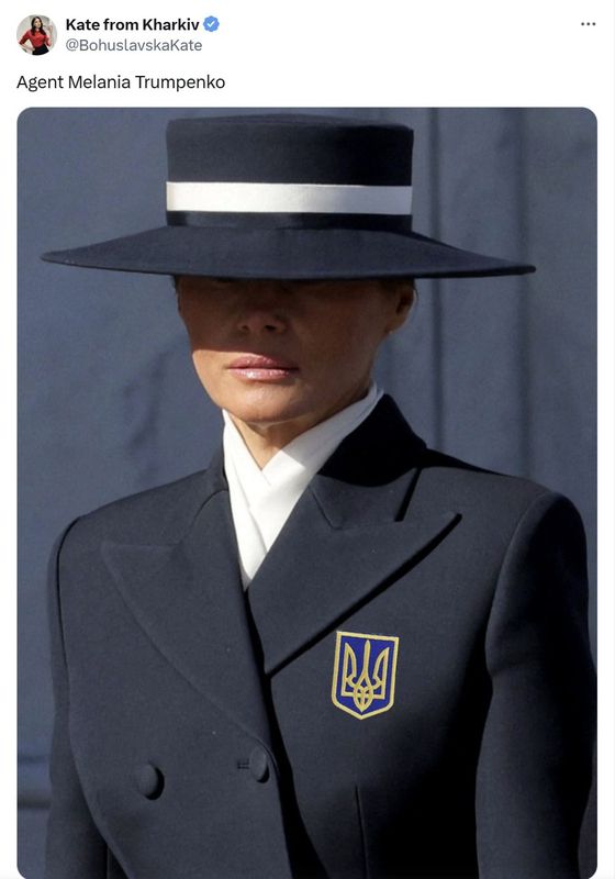 이를테면 챙이 깊은 모자로 얼굴을 절반쯤 가린 멜라니아의 사진 속 왼쪽 가슴에 우크라이나의 국가적 상징인 '트리주브'(삼지창) 로고를 합성하는 식이다. 이 게시물은 멜라니아를 '요원'이라고 칭했다. 멜라니아가 마치 우크라이나 정보국 요원처럼 트럼프를 설득했다고 표현한 것으로 해석된다.