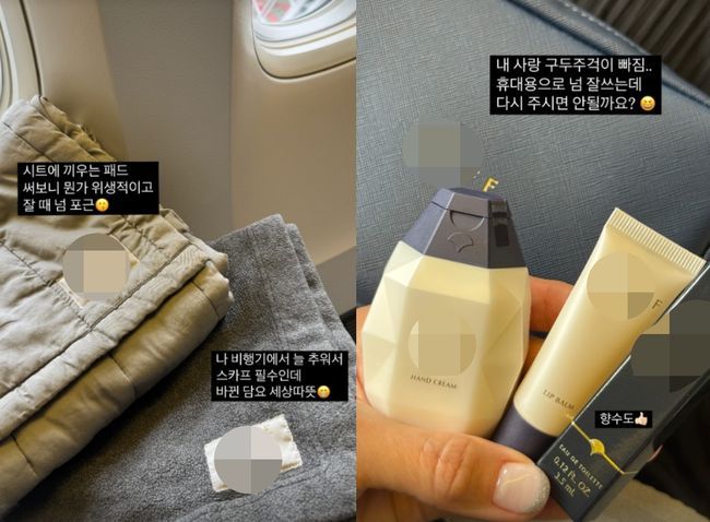 또한 그는 기내 담요 사진과 함께 "담요는 바뀌어 좋은데 무슨 깔개도 주고 복잡하다"라고 지적했고, 기내에서 제공되는 편의용품들에 대해서도 "향수 넣은 건 칭찬해. 그런데 내 사랑 구두주걱은 왜 뺐어? 여전히 파우치는"이라며 아쉬움을 밝혔다.