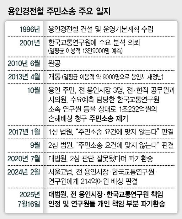 대법원은 이날 재상고심에서 용인경전철 수요 예측 용역을 수행한 한국교통연구원 연구원 3명의 배상 책임은 다시 따져야 한다며 사건을 다시 파기환송했다. 대법원은 “연구원들이 용인시와의 관계에서 어떠한 주의의무가 있었고 구체적으로 어떤 행위가 주의의무를 위반했는지, 그 행위가 사회상규에 어긋나는지, 그러한 행위를 함으로써 용인시에 직접적으로 손해를 가하였는지 등을 심리한 다음 이를 바탕으로 손해배상책임 성립 여부를 개별적·구체적으로 판단했어야 한다”고 밝혔다. 연구원들의 책임을 면밀히 심리해 배상액을 다시 결정하라는 취지다.
