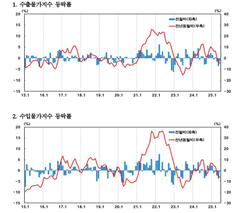 수출물가는 126.95(2020=100)으로 전월(128.39) 대비 1.1% 하락해 석달째 내림세를 지속했다. 전년 동월 대비로는 4.5% 떨어졌다. 2023년 11월(-7.9%) 이후 최대 낙폭이다.