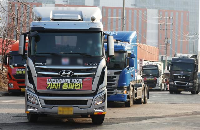 16일 국회 국토교통위원회 교통법안심사소위는 3년 일몰제를 포함한 화물차 안전운임제를 통과시켰다. 사진은 2022년 12월 경기 의왕ICD 앞에서 안전운임제 확대를 요구하는 파업 문구를 부착한 화물차가 운행하는 모습. 연합뉴스 |
