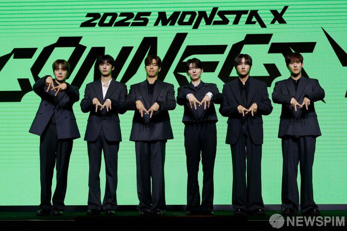 [서울=뉴스핌] 류기찬 인턴기자 = 보이그룹 몬스타엑스 멤버들이 16일 오후 서울 영등포구 콘래드 서울에서 열린 데뷔 10주년 기념 콘서트 '커넥트 엑스(Connect X)' 기자간담회에서 포즈를 취하고 있다. 2025.07.16 ryuchan0925@newspim.com
