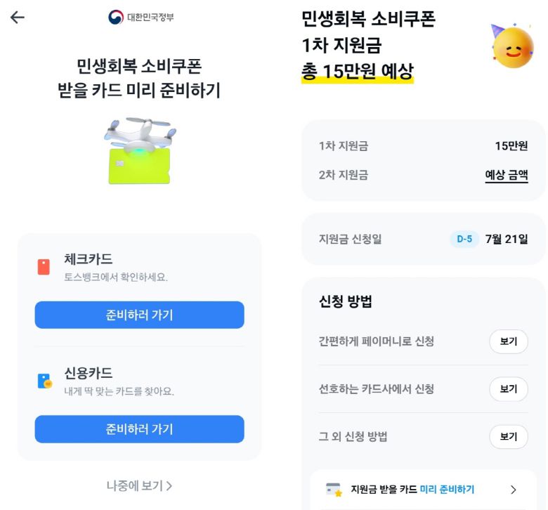 간편결제 업계가 민생회복 소비쿠폰 발급을 앞두고 전초전에 나섰다. '12조원' 달하는 소비쿠폰 발급액이 네이버페이·카카오페이·토스 등 간편결제 앱으로 몰릴 것으로 예상되는 만큼 각 간편결제사는 자사 앱을 통한 소비쿠폰 신청 시 혜택을 공개하고 전용 서비스를 제공하는 등 고객 선점에 힘쓰고 있다.