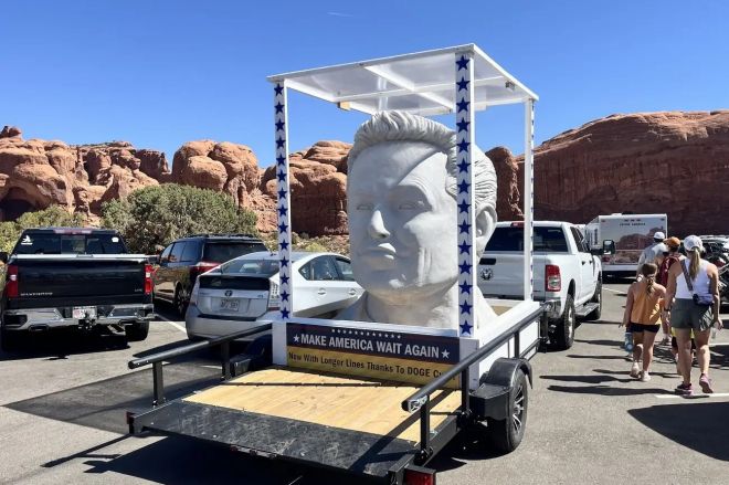 높이가 3m가 훌쩍 넘는 거대한 머스크 흉상은 지난 주말 뜬금없이 등장했는데, 아직 누가 만들어 공개했는지 밝혀지지 않았으나 의도는 명확하게 드러났다. 흉상 밑으로 ‘미국을 다시 기다리게 만들다’(MAKE AMERICA WAIT AGAIN)라는 글귀가 새겨져 있기 때문이다. 또한 그 밑으로는 ‘도지의 삭감 덕에 줄이 더 길어졌다’(Now With Longer Lines Thanks To DOGE Cuts!)는 친절한(?) 설명도 적혀있다.
