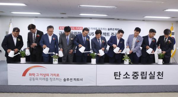 CCUS 준공식 행사 참석자들이 탄소중립실천 협약서 교환 퍼포먼스를 진행하고 있다. [사진=금호석유화학]금호석유화학은 CCUS(이산화탄소 포집∙활용∙저장) 설비 구축을 마치고 준공식을 가졌다고 16일 밝혔다.
