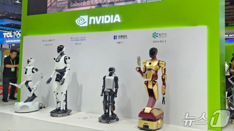 엔비디아 부스를 방문하자마자 4대의 휴머노이드 로봇이 눈에 들어왔다. 최근 베이징에서 열린 휴머노이드 로봇 마라톤 대회에서 1등을 한 톈궁 2.0 외에도 갈봇의 G1, 자쑤진화의 '자쑤 T1', AI 로보틱스의 알파봇2 등 중국 업체의 제품들이다.