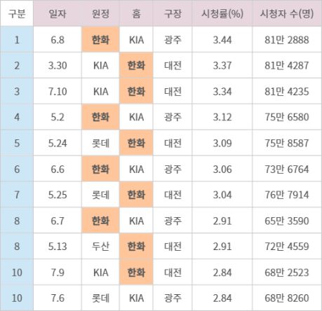2위는 3월 30일 KIA와 한화의 대전 경기(시청률 3.37%)였고, 3위는 7월 10일 KIA와 한화의 대전 경기(3.34%), 4위 역시 5월 2일 한화와 KIA의 광주 경기(3.12%)였다.